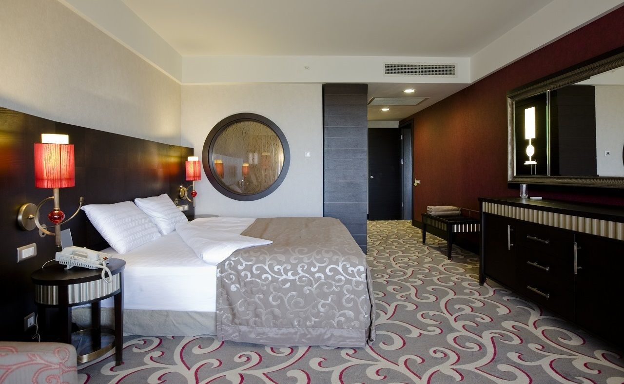 Elegant standard rooms are 42 to 50 m2 and comfortable enough for double accommodation. All rooms include; bath, central air conditioner, telephone, internet connection, pay TV,  an interactive and satellite LCD television, mini-bar, safe box, balcony and hairdryer. Facility also provide; The billiards, bowling (4 bands), Fun World, squash, water sports and all day entertain- ment activities, 2 amphitheatres (indoor and outdoor), Gym. Dry-cleaning service, wireless internet access in the public areas.